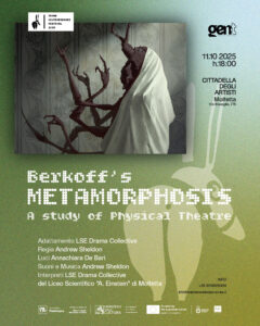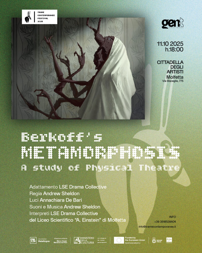 i ragazzi del LSE Drama Collective del Corso Cambridge del Liceo Scientifico “A. Einstein” Molfetta porteranno in scena uno studio del teatro fisico di Berkoff usando il suo adattamento della Metamorfosi di Kafka come mezzo attraverso il quale capire la sua idea del teatro con il suo uso di movimenti, ensemble work e voce. Cio che è venuto fuori non è lo spettacolo intero ma un adattamento, una scelta e studio dei vari momenti. Attraverso movimenti e messa in scena stilizati, the LSE Drama Collective ha cercato di capire e rispettare la metamorphosi di Berkoff come lui ha onorato il lavoro originale di Kafka in una produzione in Inglese del teatro dell’impossibile.