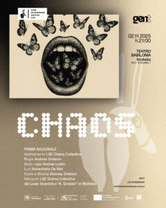 Un incidente in una stazione ferroviaria. Qualcuno si rinchiude in una stanza. Uno porta dei fiori a un altro. Un incidente su un autobus. Una protesta. Un ragazzo non sa chi sia. L’effetto a catena di una farfalla…CHAOS di LSE Drama Collective è una sinfonia di scene dislocate e interconnesse. Una serie di personaggi influenzati dalle ali di una farfalla, cercano un significato in un mondo complicato e instabile. Saltando attraverso la fisica, il cosmo, l’amore e la violenza, trovano ordine nel disordine e la celebrazione del caos.