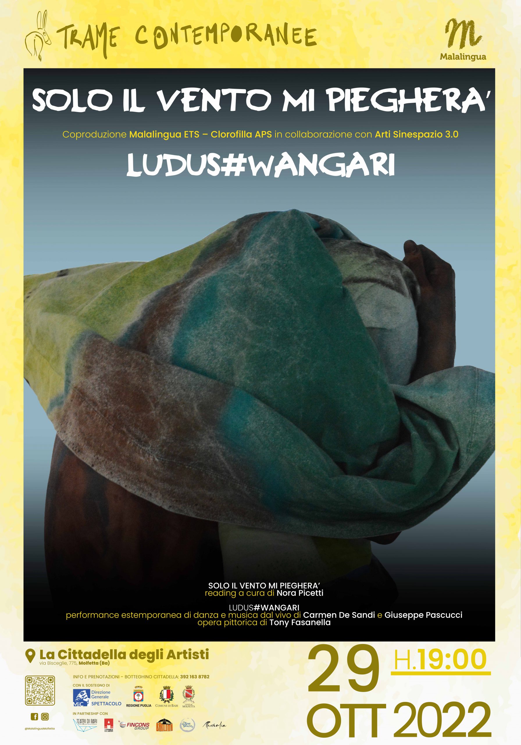 H.19:00 SOLO IL VENTO MI PIEGHERA’ Reading a cura di Nora Picetti, performance estemporanea di danza e musica dal vivo di Carmen De Sandi e Giuseppe Pascucci Coproduzione Malalingua ETS – Clorofilla APS in collaborazione con Arti Sinespazio 3.0