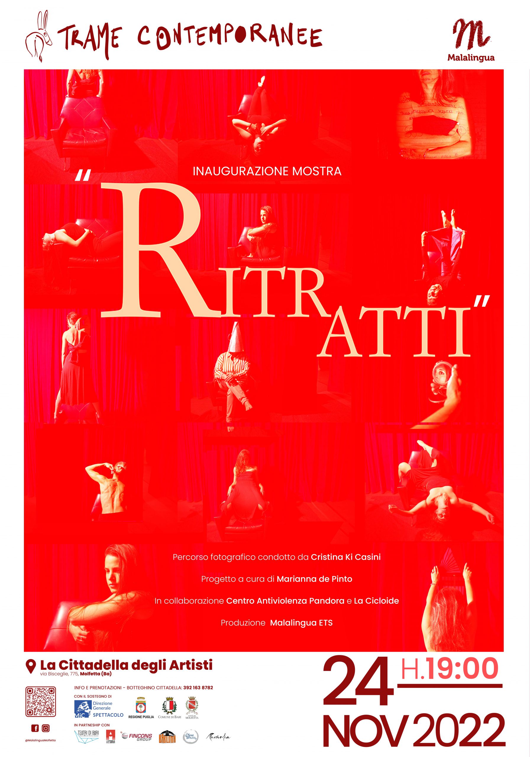 H.19:00 INAUGURAZIONE MOSTRA “RITRATTI” a cura della fotografa Cristina Ki Casini progetto a cura di Marianna de Pinto Incursioni performative di Carmen De Sandi e Giuseppe Pascucci Produzione Malalingua ETS